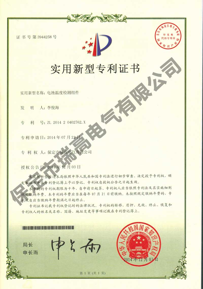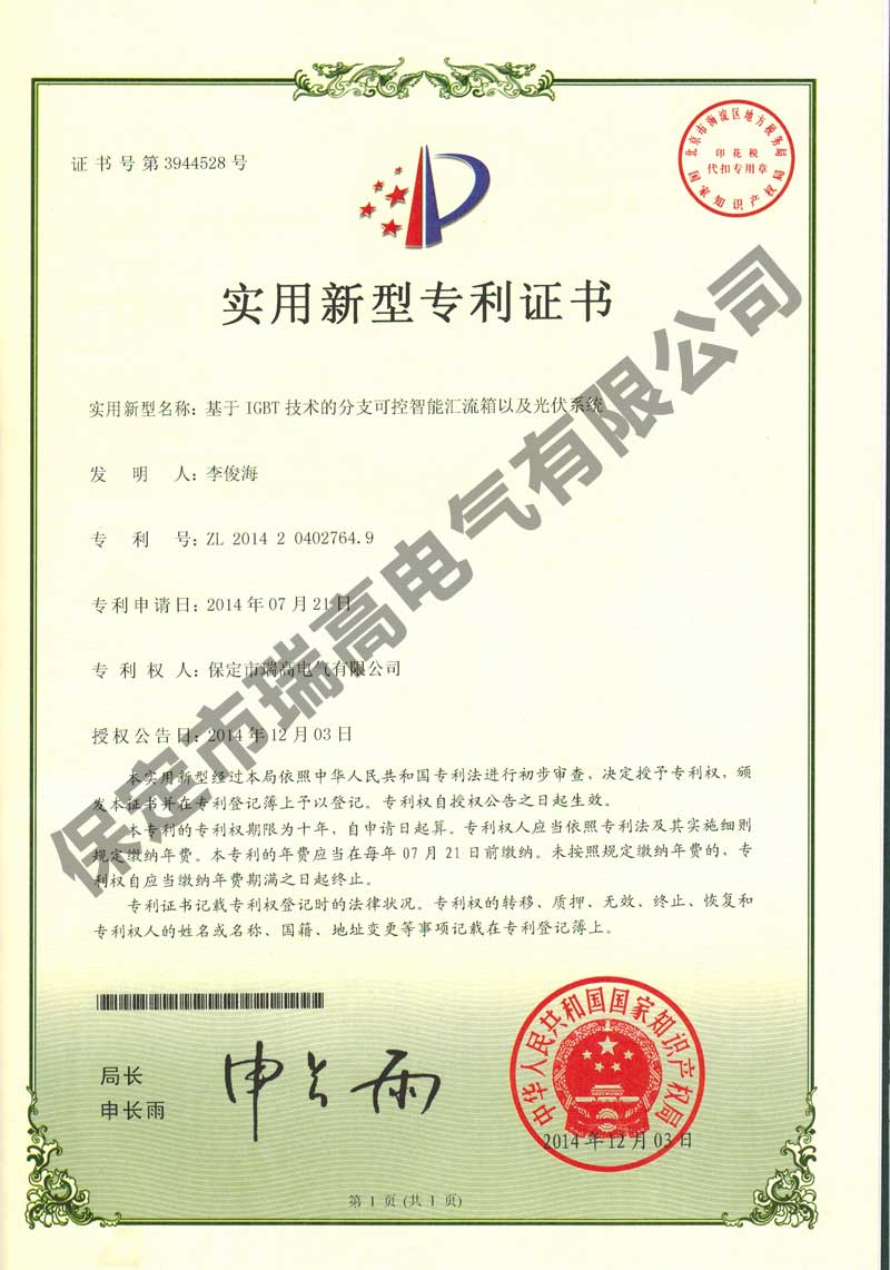 職業(yè)健康安全管理體系認證證書職業(yè)健康安全管理體系認證證書質(zhì)量體系認證證書質(zhì)量體系認證證書電池溫度檢測組件電池溫度檢測組件放電間隙放電間隙基于IGBT技術(shù)的分支可控智能匯流箱以及光伏系統(tǒng)基于IGBT技術(shù)的分支可控智能匯流箱以及光伏系統(tǒng)新型智能型變壓器風(fēng)冷控制柜實用新型專利證書新型智能型變壓器風(fēng)冷控制柜實用新型專利證書箱變智能監(jiān)控系統(tǒng)箱變智能監(jiān)控系統(tǒng)智能泄露電流監(jiān)測傳感裝置以及泄露電流監(jiān)測系統(tǒng)智能泄露電流監(jiān)測傳感裝置以及泄露電流監(jiān)測系統(tǒng)